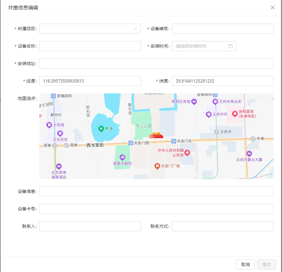 通过平台,添加管网井盖设备时,可精确填写位置信息并地图选点,确保每口井盖与管网网络精准关联