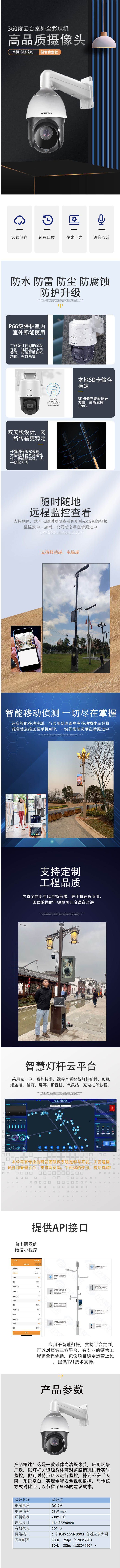 ● 4寸球机,200W像素 ● 支持最大1920×1080@30fps高清画面输出 ● 采用高效红外阵列,低功耗,照射距离达100m ● 支持360°水平旋转,垂直方向-15°-90° ● 支持300个预置位,8条巡航扫描 ● 支持 POE+(802.3at)供电 ● 支持海康SDK、ONVIF、CGI、PSIA、GB/T28181、E家协议和萤石云接入 ● 防雷、防浪涌、防突波,IP66防护等级